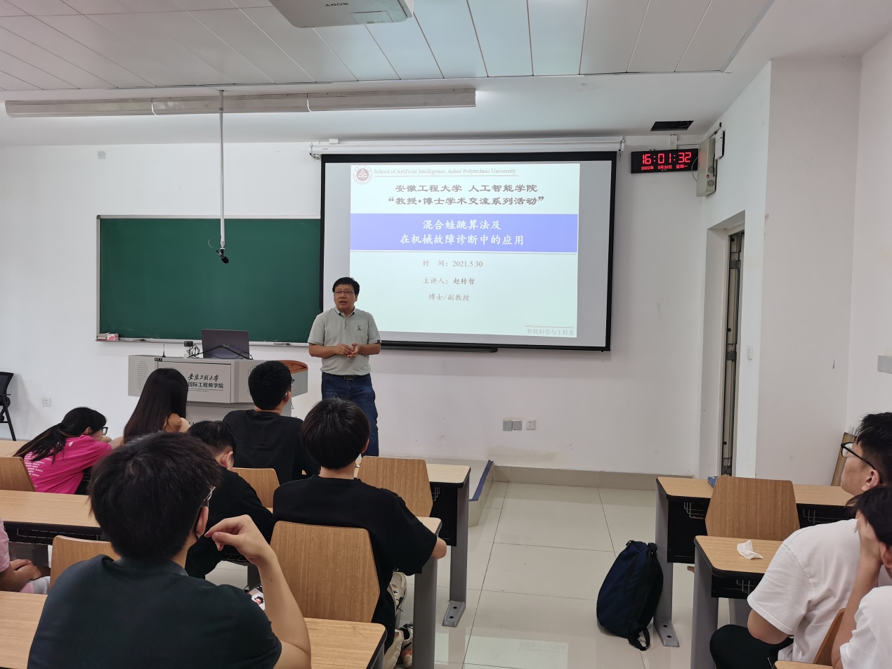赵转哲博士主要从事机械故障智能诊断和智能计算等研究内容。赵博士做了题为“混合蛙跳算法及在机械故障诊断中的应用”报告,概括地介绍了群智能优化算法的发展历史,总结了基于群智能的各类具体优化算法,围绕群智能优化算法—混合蛙跳算法(Shuffled Frog Leaping Algorithm, SFLA),重点讲解了SFLA算法的基本原理,深入讨论了SFLA个体收敛性和全局收敛性、算法复杂度以及算法的参数效能,最后以在机械故障智能诊断中的工程应用为例,分别介绍了基于遗传算法思想的SFLA改进及在传感器优化布置中的应用研究、基于混沌思想改进SFLA及在轴承早期故障诊断中的应用和基于竞争策略改进SFLA及在机械故障聚类分析中的应用等内容。