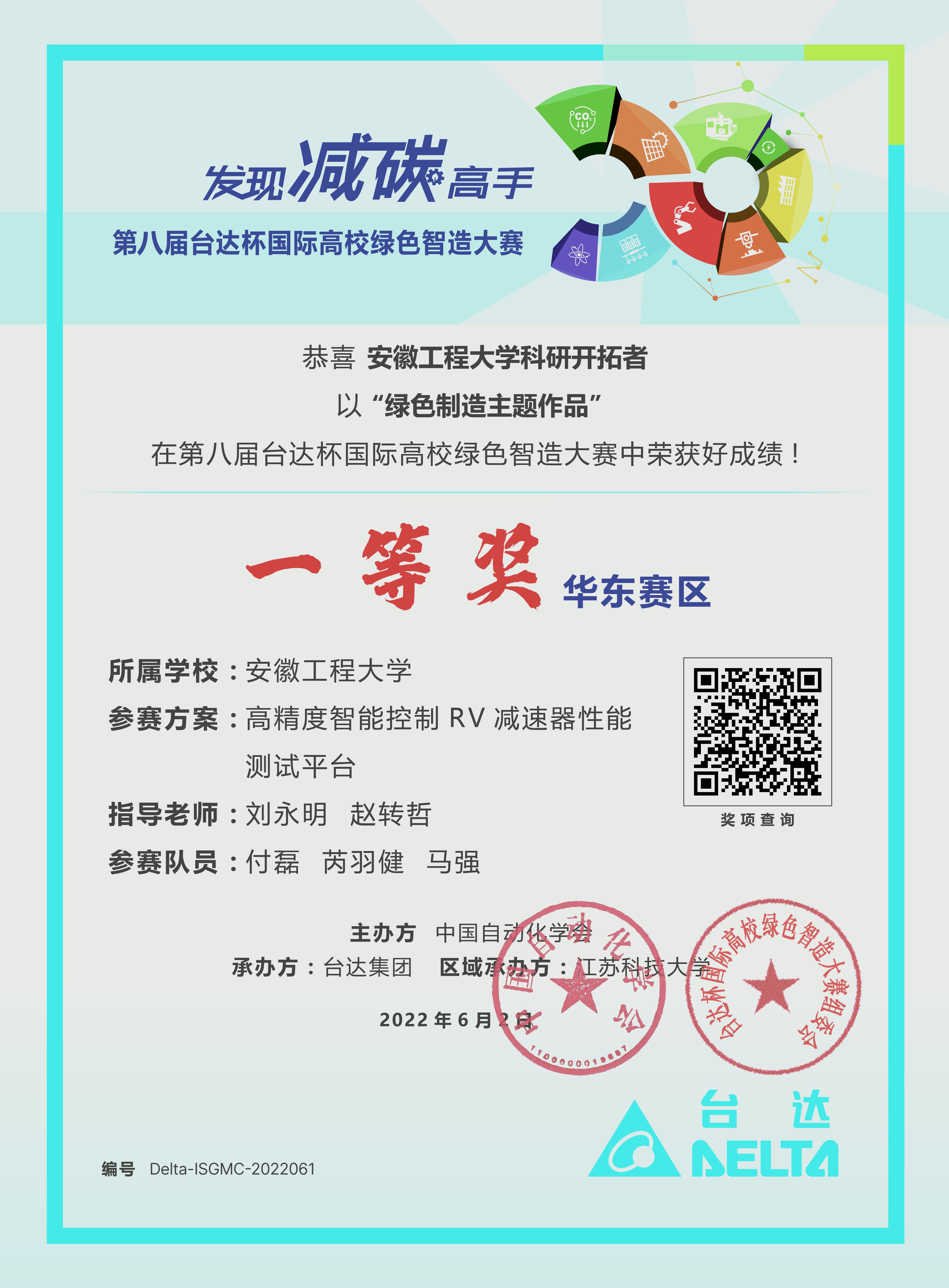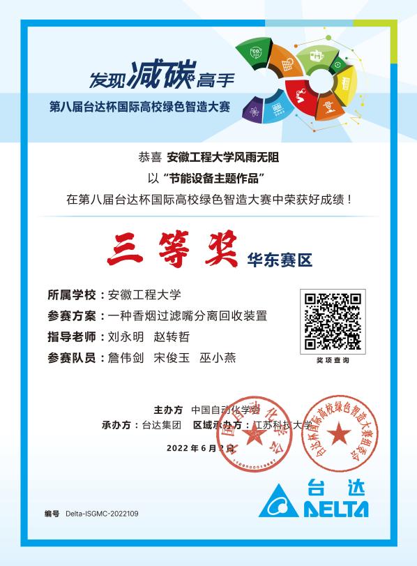 日前,由中国自动化学会主办的第八届台达杯国际高校绿色智造大赛华东赛区在江苏科技大学顺利闭幕,由机械工程学院(澳门六合彩内幕 )赵转哲、刘永明、张振、陈玉等教师指导的研究生作品参赛,经过激烈的角逐,4件作品分别获一等奖、二等奖和三等奖以及优胜奖。