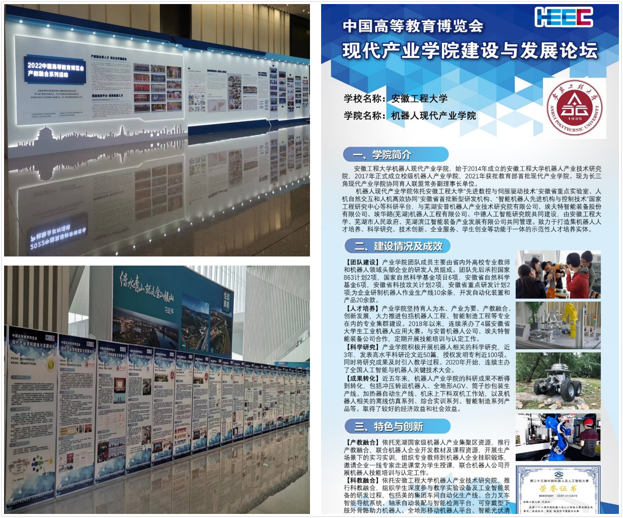安徽工程大学机器人产业学院为教育部首批现代产业学院,现为长三角现代产业学院协同育人联盟常务副理事长单位,正致力于打造集人才培养、科学研究、技术创新、企业服务、学生创业等功能于一体的示范性人才培养实体,已基本完成产业学院运行管理制度及相关标准的制定工作,将逐步推进产教融合协同育人模式构建与改革实践。应本次论坛主办方的邀请,我校机器人现代产业学院现场展示了建设成效及特色创新方面的内容。