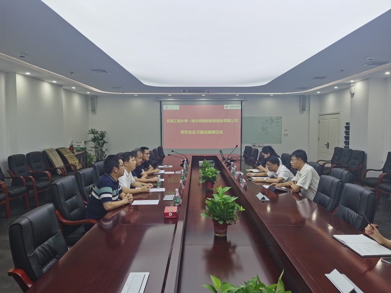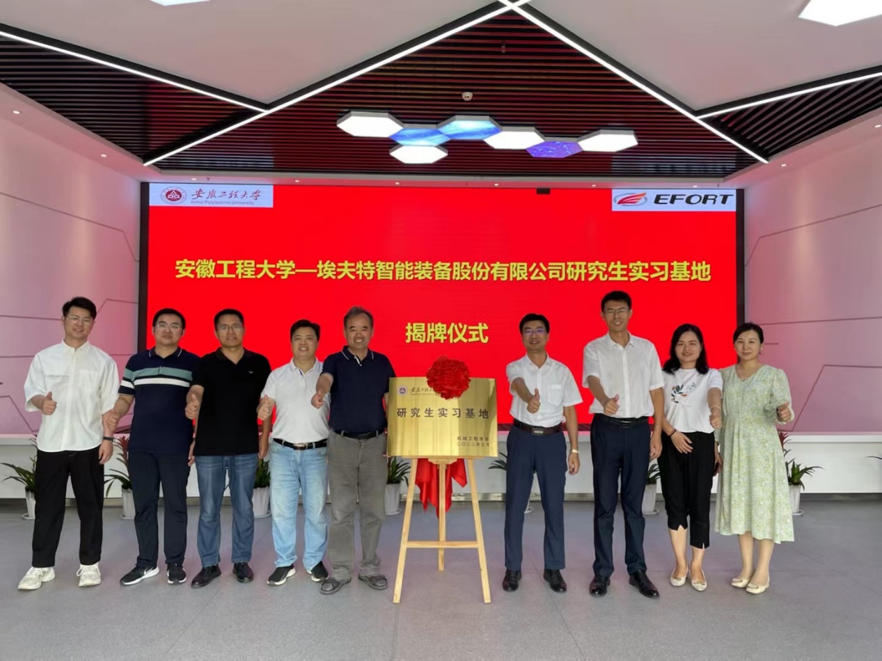座谈交流之后,许礼进董事长和伊长文书记为“安徽工程大学-埃夫特智能装备股份有限公司研究生实习基地”正式揭牌。双方表示将深入推进后续合作。