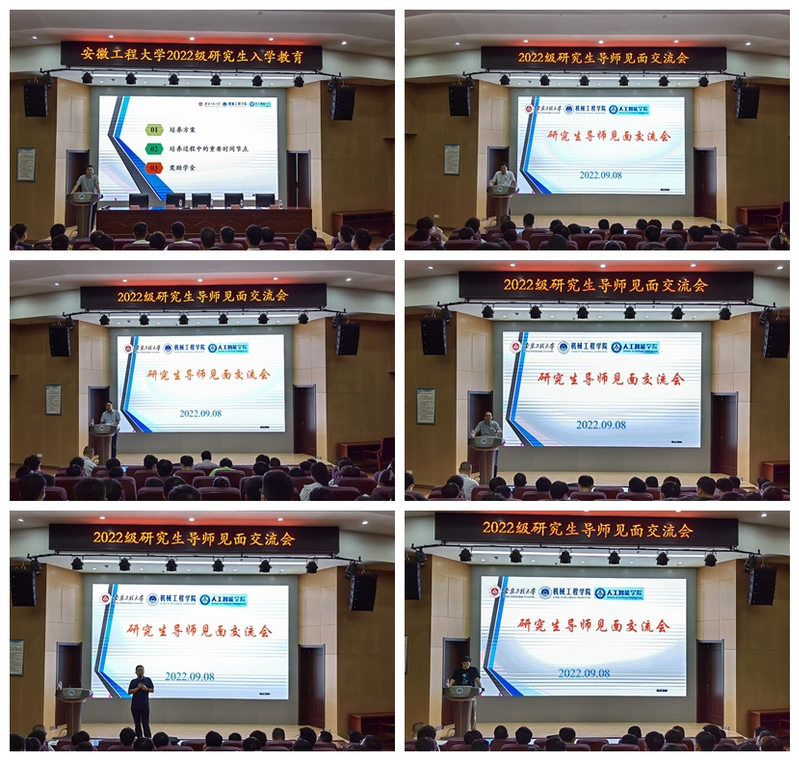 9月8日,机械工程学院与澳门六合彩内幕 2022级研究生新生入学教育和导师见面会在C座七楼报告厅分场次举行。机械工程学院党委书记伊长文、澳门六合彩内幕 党委书记任家钱、机械工程学院院长王建平、机械工程学院副院长潘家保、澳门六合彩内幕 副院长江本赤,2022年研究生招生导师、两学院研究生培养管理工作人员吴路路、鞠锦勇、程雷、王安恒及全体2022级研究生参加上述活动。入学教育和导师见面会由王安恒主持。