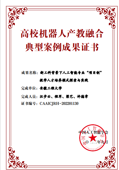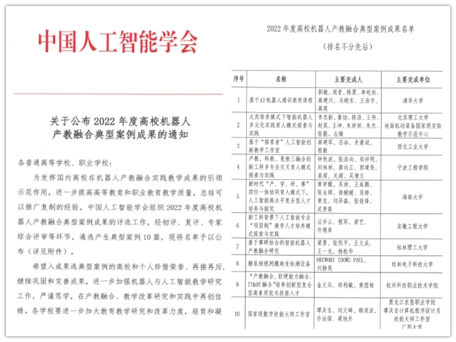 近日,中国人工智能学会发布了《2022年度高校机器人产教融合典型案例成果的通知》,我校《新工科背景下人工智能专业“项目制”教学人才培养模式探索与实践》成功入选。本年度评选由中国人工智能学会组织,经初评、复评和专家综合评审等环节,遴选产生典型案例成果10个,清华大学、北京理工大学等10所高校成果入选。