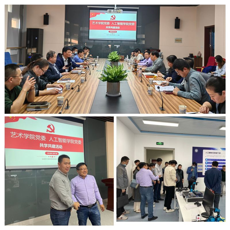 党委副书记李文江、艺术学院党委副书记彭海燕先后领学了党的二十大报告中部分内容,任家钱带领全体人员深入学习了安徽工程大学关于学习宣传贯彻落实党的二十大精神方案和任务清单,胡家增带领全体人员就开辟马克思主义中国化时代化新境界相关学习内容展开研读。专题研讨环节,两院教师代表详细介绍了本学科的基本情况、学科建设目标、学科布局、学科特色等内容,结合党的二十大报告中对“教育”“科技”“人才”以及“高质量教育体系建设”等内容,汇报了相关学科建设、人才培养、科学研究、学术交流、对外合作等方面的发展思路、目标任务和改革举措。艺术学院常务副院长张学东就智能技术与设计文化实验室建设情况向全体参会人员做详细介绍,对用自然科学的方法从事哲学社会科学的研究表达了憧憬,对两学院后续在相关领域不断深化合作、共谋发展充满期待。会上,工业设计系教师党支部与智能科学与工程系教师党支部正式建立共建关系,并围绕如何开展好后续的结对共建活动进行了探讨。