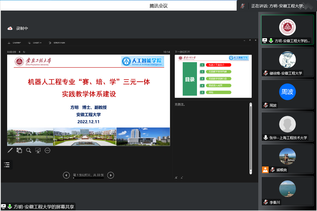 报告中,方明介绍了我校机器人工程专业的建设历程、专业人才培养定位和育人成效,以及依托专业实践资源举办工业机器人应用大赛、机器人技能培训和创新能力训练的探索实践,并以校企联合研制的滚动轴承自动装配及智能检测平台为例,与参会代表交流了产教融合实践模式以及面向工业应用场景培养学生集机械、电气、气动和控制的机器人专业综合能力的具体案例。同时,介绍了我校已连续四届承办的安徽省大学生工业机器人应用大赛相关情况。