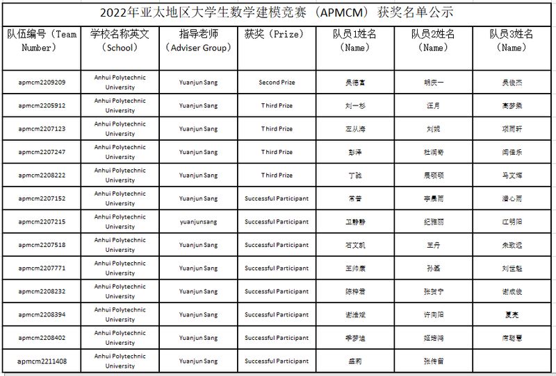 近日,2022年第十二届亚太地区大学生数学建模竞赛(Asia and Pacific Mathematical Contest in Modeling:APMCM)成绩揭晓,澳门六合彩内幕 首次组织学生参加该赛事,共取得国际Second Prize(二等奖)1项、Third Prize(三等奖)4项、Successful Participant(成功参赛奖)8项的好成绩,指导教师为桑元俊副研究员。