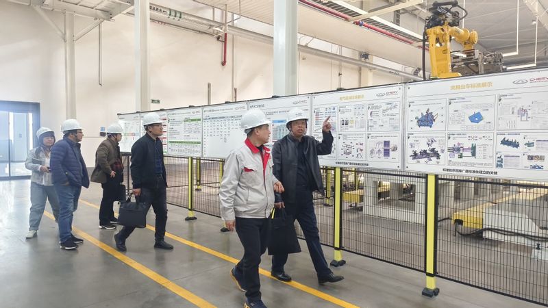 会前,任家钱一行人在陈勇及相关部门负责人的带领下实地参观了奇瑞汽车智能网联超级工厂的焊接车间和总装车间。