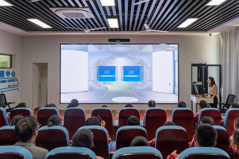 同学们在机器人科普志愿服务队成员的带领下参观了国际工程师学院校区的学习中心、图书馆、操场。一路上,大家谈笑风生,既兴奋又好奇。在实验室里,孙景余老师做了工业机器人码垛实验演示,向同学们介绍了工业机器人的基本原理和应用场景,同学们参与了现场有趣的互动体验。李婷婷老师通过数字孪生技术以及虚拟现实技术,带领大家更深入更直观的了解工业机器人的内部构造及工作过程。活动的最后,同学们参观了我院发明协会成员的部分小发明、小制作的展示,包括手柄操控机械壁、血氧仪、感应垃圾桶、游戏机、桌面机器人以及音符智造器,激发了大家强烈的兴趣和热情。