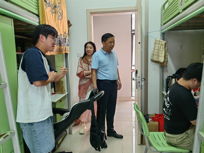 学院领导任家钱、李文江、江本赤带领各年级辅导员深入学生宿舍,实地了解学生思想动态、学习、宿舍安全卫生等状况,并为学生送去暖心关怀和问候。同时叮嘱同学们要及时调整状态,尽快适应返校后的学习与生活节奏。李文江提醒同学们,认真学习的同时,还要重视个人和集体卫生,保持宿舍干净、整洁、卫生,共同营造一个安全、舒适、友爱的寝室环境。任家钱鼓励2024届的考研学子,希望大家坚定信心、踏实学习、认真备考,争取为自己的大学生生涯交上一份满意的“答卷”。