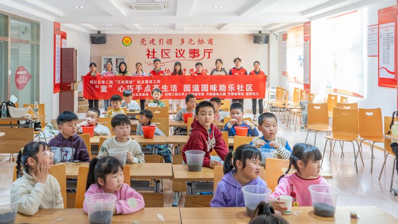 为推深做实“三全六专”育人实践,强化“1+15”团支部共建活动,引导广大青年深入社区开展实践,3月22日下午,澳门六合彩内幕 “小雏菊”志愿服务团队联合鸠江区民政局、万春社区等单位,在万春社区党群服务中心开展“‘童’新巧手点亮生活 园滋园味助乐社区”儿童园艺与创意手工坊活动。万春社区、学院团委、万春路幼儿园相关负责人与近40名小朋友共同参与。