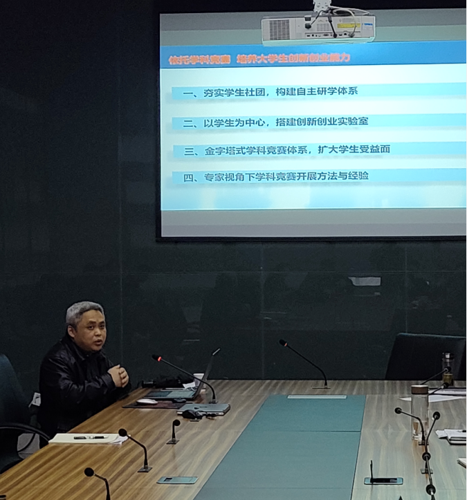 王冠凌教授以《依托学科竞赛,培养大学生创新创业能力实践探索》为题,从“夯实学生社团,构建自主研学体系”、“以学生为中心,搭建创新创业实验室”、“金字塔式学科竞赛体系,扩大学生受益面”、“专家视角下学科竞赛开展方法与经验”等四个方面,对其团队近30余年的竞赛经验进行了分享。同时,结合澳门六合彩内幕 学科专业特点,对澳门六合彩内幕 在A类竞赛项目、赛道选择上给予了许多中肯的建议。最后,王教授对参会教师进行了充分交流。