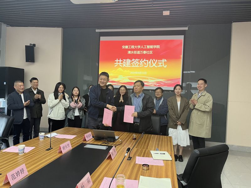 为深入学习宣传贯彻党的二十大精神,切实把二十大精神落实到基层建设实践中,进一步加强校社联动,发挥实践育人作用,4月12日,清水街道党工委委员齐颖婕、万春社区党委书记潘峰等一行来到安徽工程大学澳门六合彩内幕 开展共建签约,澳门六合彩内幕 党委书记任家钱、澳门六合彩内幕 党委副书记李文江、智能科学与工程系系主任赵转哲及部分师生党支部书记出席,活动由任家钱主持。