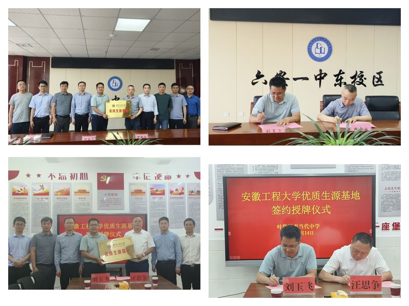 交谈后,分别与叶集皖西当代中学、六安一中东校区签署了《安徽工程大学“优质生源基地”合作协议》,并授予“安徽工程大学优质生源基地”牌匾,对高中近年来为学校输送大量优质生源表示感谢。
