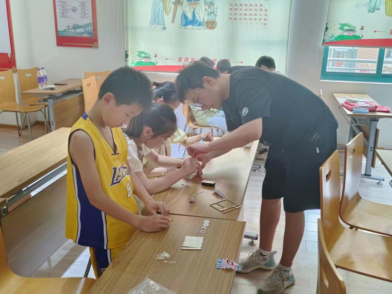 讲座结束后,团队成员为社区小朋友们发放材料包,并分组指导他们完成趣味“爬虫”机器人的制作。小朋友们有的苦思冥想,有的积极提问,大家相互协作,经过近一个小时的努力完成了机器人的初步拼装制作。随后,小朋友们用颜料涂上喜欢的颜色,把机器人装饰成独一无二的模样。之后进行作品展示评比,团队成员对小朋友优秀的作品进行奖励。