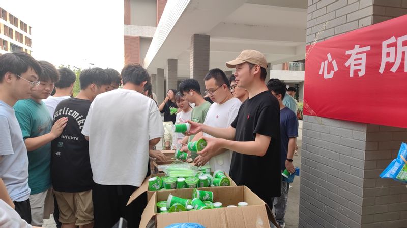 西瓜、绿豆沙冰、牛奶、雪糕、薯片,各式各样夏日解暑饮品吸引了同学们的驻足。功能型党支部的同学们引导着大家有序排队,并温馨提醒现场同学们让自己的小伙伴速来领取福利。随着夕阳的余晖洒满校园,学院教师苑雨露、杨顺、郑昊亲自上阵,将一份份满载心意的慰问品亲手送到学生手中。一杯杯冰凉的绿豆汤,清甜解暑,是对同学们健康的深切关怀,更是希望他们能在酷暑中为理想奋斗。