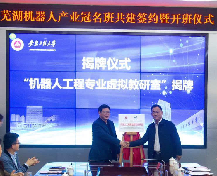 开班仪式上,教务处处长夏登峰、机器人现代产业学院院长许德章代表学校与许礼进分别签署了“芜湖机器人产业冠名班”共建协议和“芜湖市机器人实训基地”共建协议,王成军、杨少华、许礼进、陆先富、蔡金平、肖宗明共同为“芜湖机器人产业冠名班”、“芜湖市机器人实训基地”、“机器人工程专业虚拟教研室”揭牌,王成军为园区重点企业相关负责人颁发了“芜湖机器人产业冠名班”课程教授聘书。