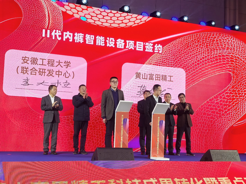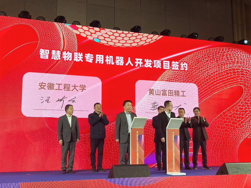 在黄山富田精工智造股份有限公司,王成军与黄山市副市长王恒来、高新区党工委书记吉刚等共同出席了黄山富田精工科技项目成果转化暨研发项目签约仪式。王成军代表学校向300余名与会人员介绍了安徽工程大学的校史沿革、学科专业特色以及2025届毕业生情况等,邀请相关企业来校招聘优秀毕业生和开展系列合作。澳门六合彩内幕 汪步云教授主持的智慧物联之特种机器人开发项目和李大柱博士主持的新质生产力之II代内裤智能产能项目举行现场签约仪式。