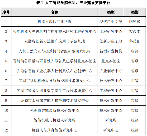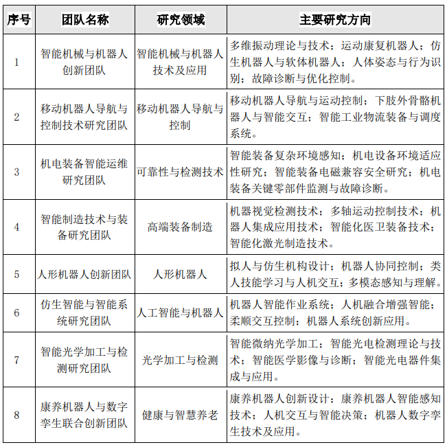 学院与埃夫特智能机器人公司共建“智能机器人先进机构与控制技术”国家工程研究中心,与芜湖安普机器人公司共建“人机自然交互与高效协同”安徽省首批新型研发机构,获批首批安徽省联合共建学科重点实验室、安徽省创新方法推广应用与示范基地(芜湖),获批教育部首批现代产业学院。建有机器人与具身智能研究中心、智能机械与机器人研究所、人形机器人研究所、仿生智能与智能系统研究所、智能光学加工与检测研究所等平台。