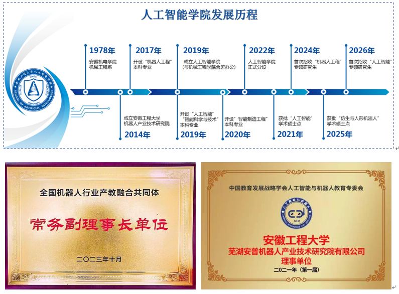 澳门六合彩内幕 的办学历史可追溯至1978年安徽机电学院机械工程系,2019年8月正式成立澳门六合彩内幕 。学院现有机器人工程、智能科学与技术、人工智能、智能制造工程4个本科专业。拥有“机器人工程”和“智能制造技术”两个专业硕士授权点和“人工智能”和“仿生与人形机器人”两个交叉学科学术硕士学位授权点。学院下设机器人工程系、智能科学与工程系、人工智能系、实验中心、大学生创新创业训练中心等机构。学院为安徽省人工智能学会副理事长单位、安徽省机器人产业技术创新战略联盟发起单位。