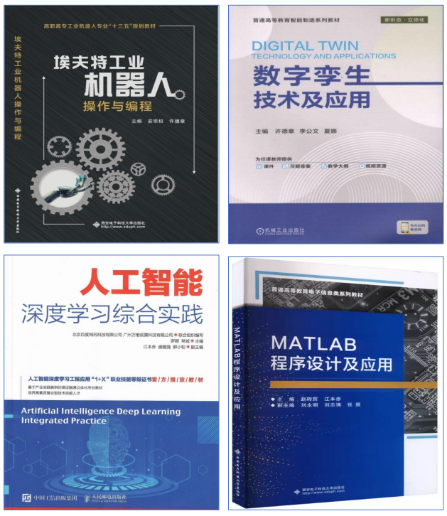 课程及教材建设成果显著。建成《工业机器人轨迹规划及虚拟仿真实验》《MATLAB程序设计》国家级一流课程,,主编/参编《埃夫特工业机器人操作与编程》《数字孪生技术及应用》《人工智能深度学习综合实践》《MATLAB程序设计及应用》等近10部教材。其中《人工智能概论》《MATLAB程序设计及应用》获得2025年全国高校人工智能领域图书一等奖。