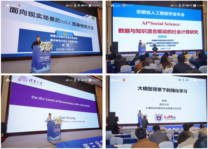 在大会主题报告环节,重庆邮电大学教授肖斌,中国科学院自动化研究所研究员郑晓龙,清华大学自动化系副教授黄高,南京大学澳门六合彩内幕 副院长俞杨分别作了“面向现实场景的生成图像检测理论与方法研究”、“数据与知识混合驱动的社会计算与决策智能研究”、“推理大模型的能与不能”、“大模型背景下的强化学习”的主旨报告,围绕人工智能前沿技术和产业发展进行深度交流。中国科学技术大学特任教授王文杰,浙江大学智能科学与工业软件所副所长、特聘研究员张宁豫分别作了“大模型个性化研究与应用”、“知识驱动大模型智能体”的青年学者讲习班报告,围绕如何聚焦人工智能前沿技术,不断拓宽学术视野、把握前沿技术趋势,与参会青年教师和研究生进行了交流探讨。