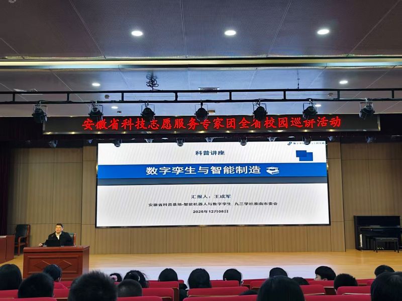 为积极履行“智能机器人与数字孪生”省级科普基地的社会服务职能,推动前沿科技知识普及,助力青少年科学素养提升,2025年12月8日下午,基地负责人、副校长王成军受邀走进芜湖市鸠兹中学,以“数字孪生与智能制造”为主题开展科普讲座,为该校学子开展了一场精彩的科技普及报告,为校园文化注入了鲜活的科技力量。